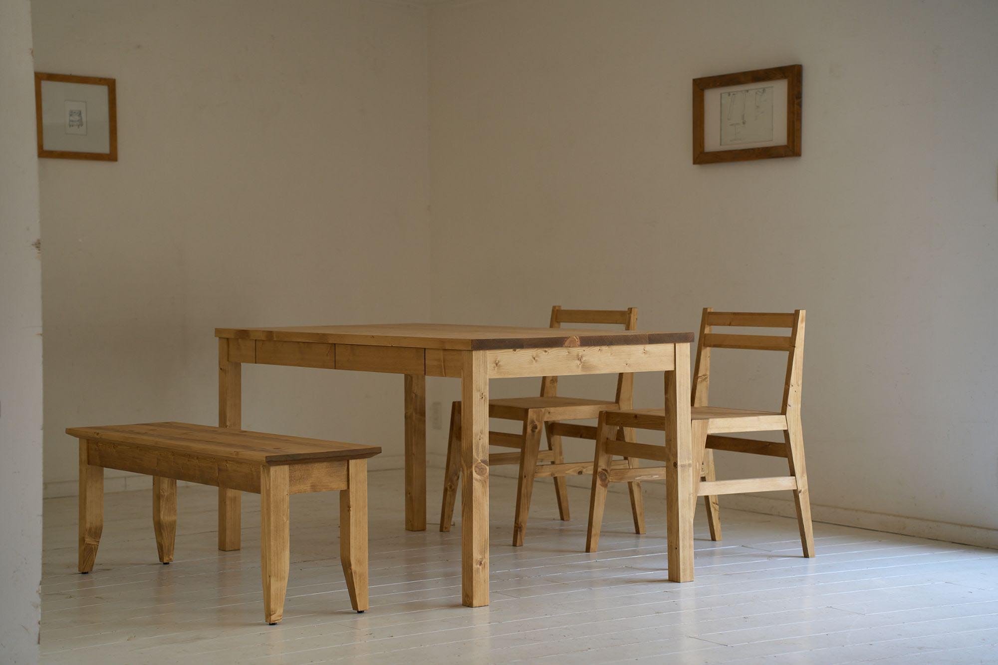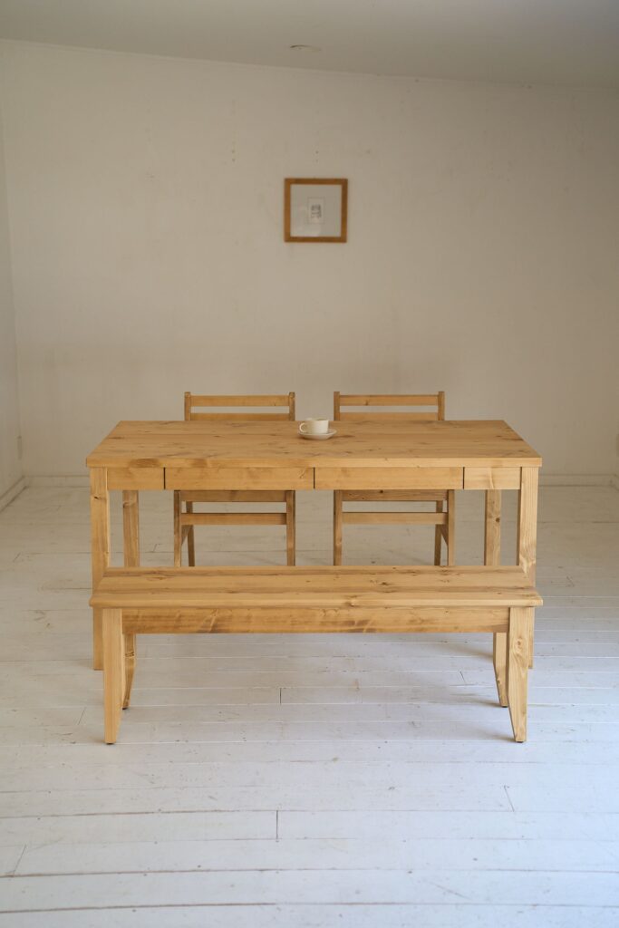 幅150センチのダイニングテーブルとベンチ、椅子2脚の合計4点セット。
