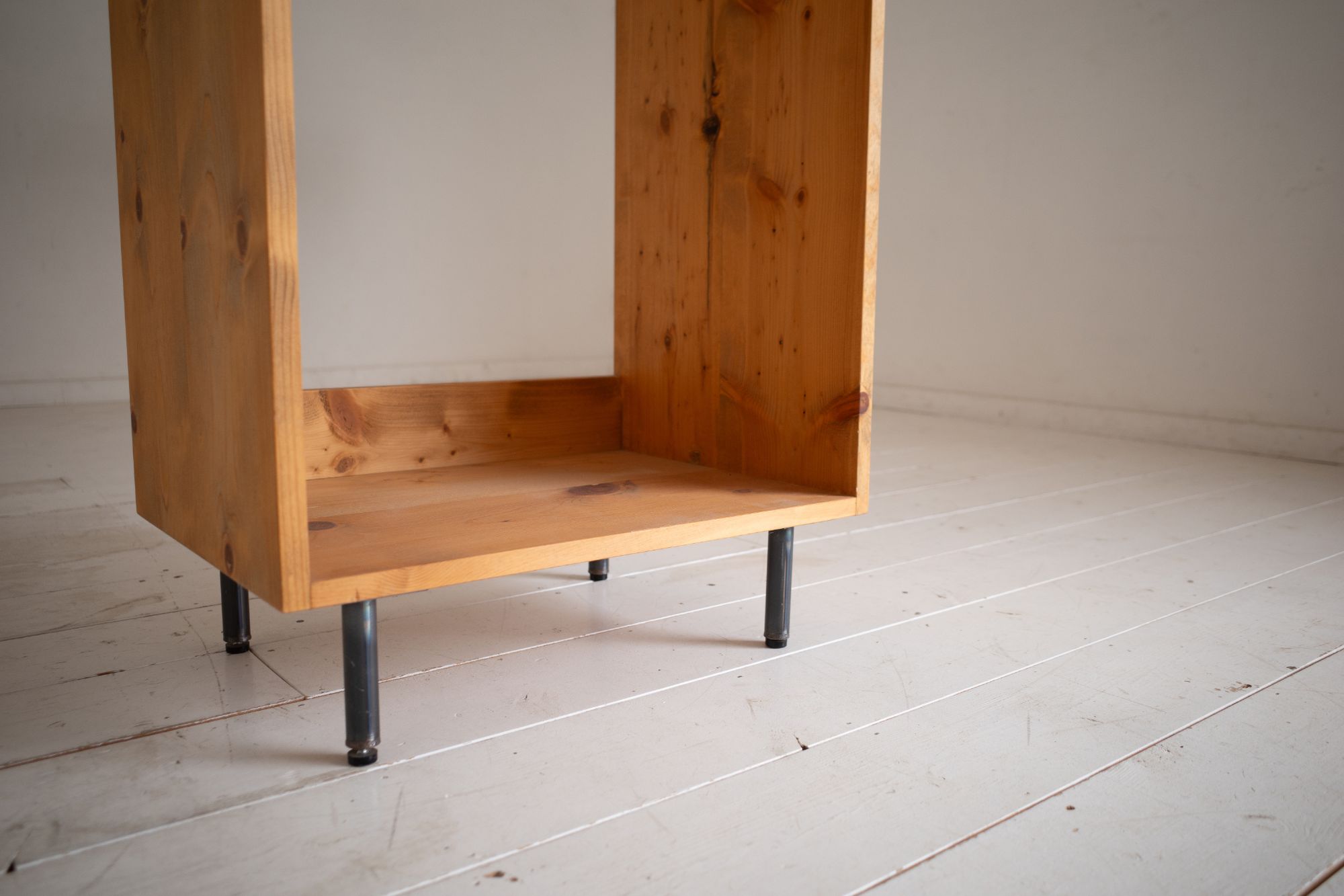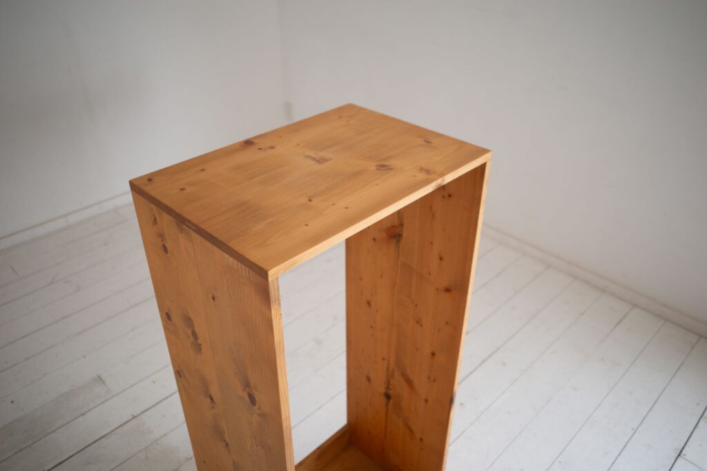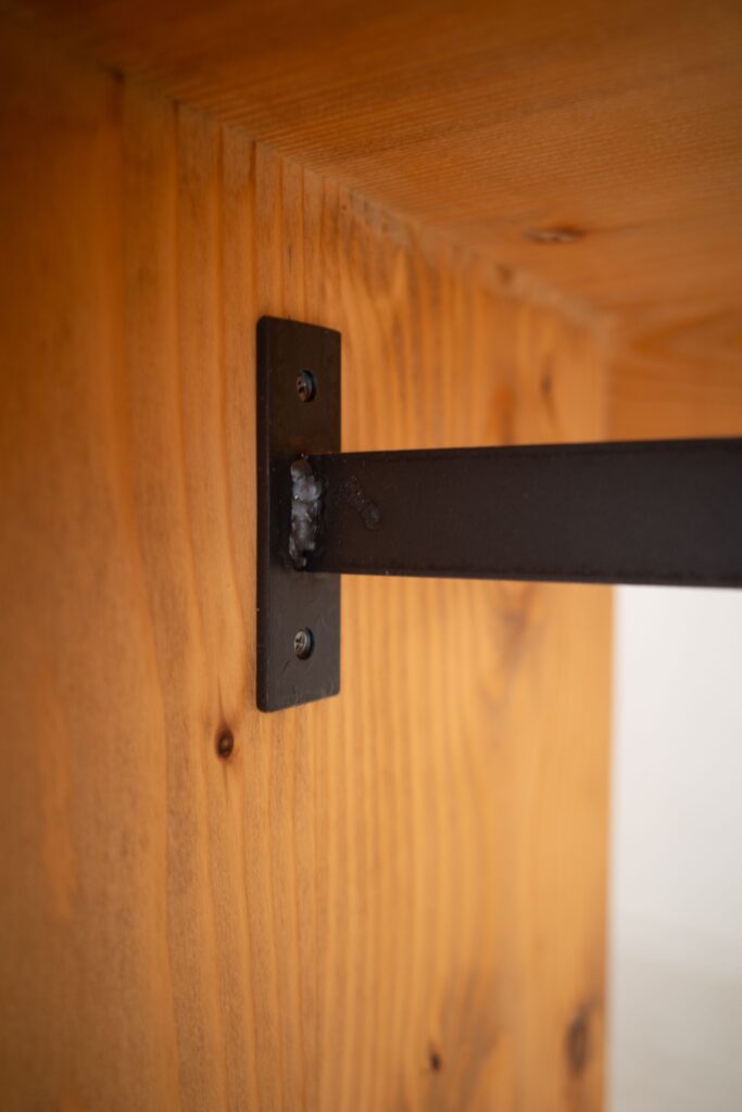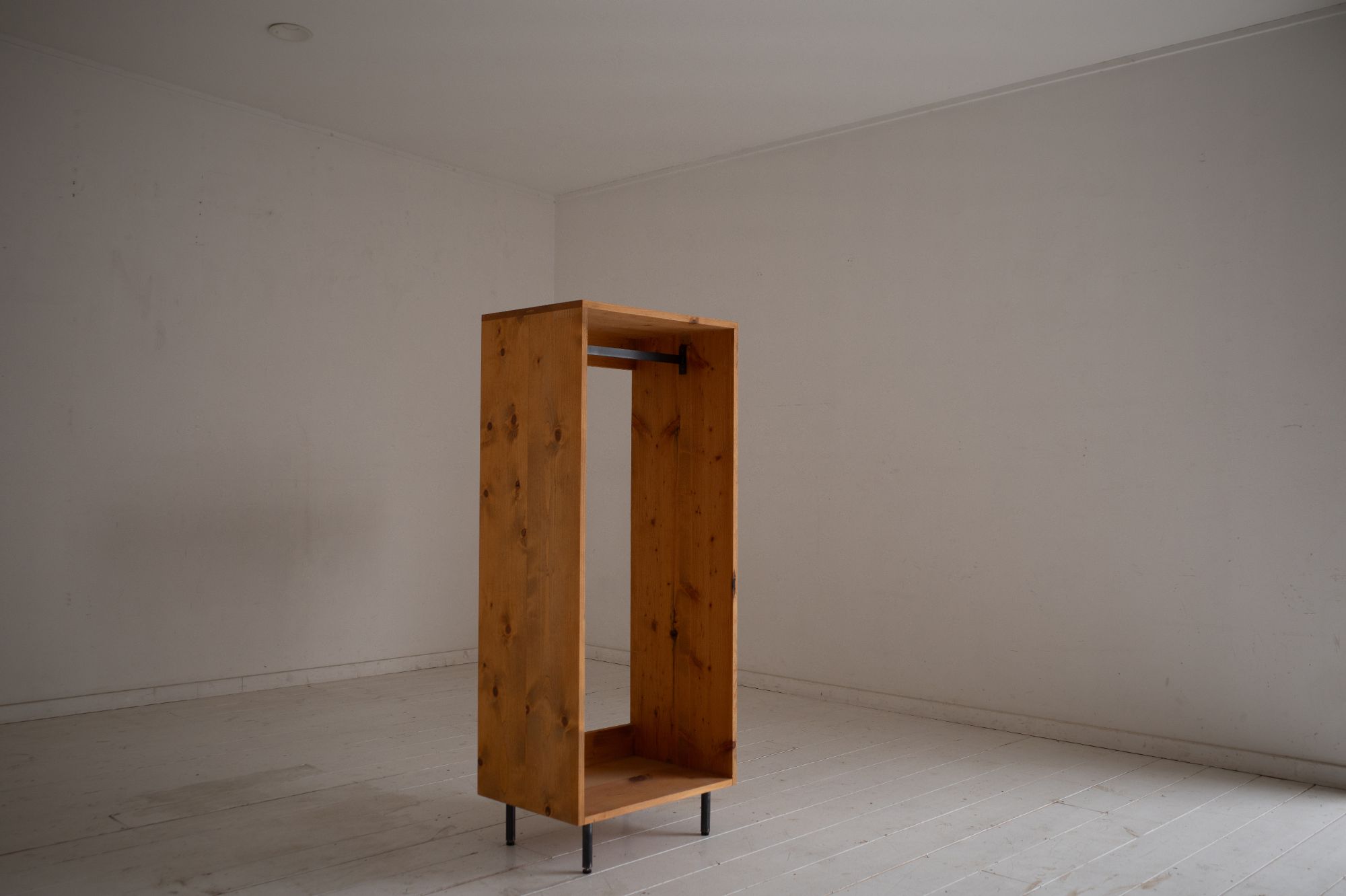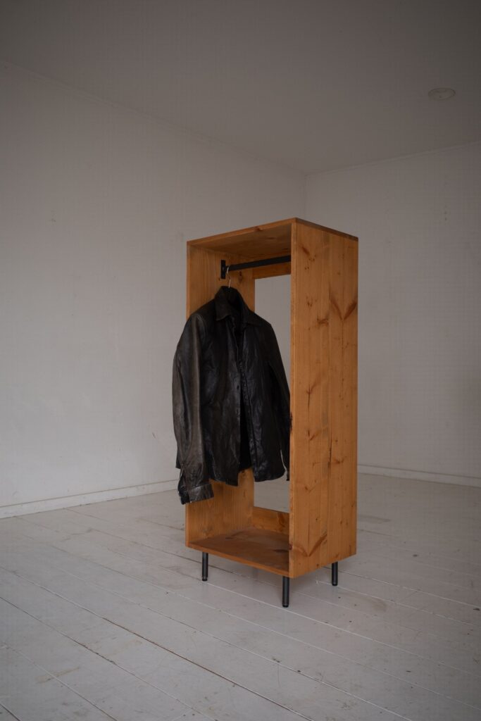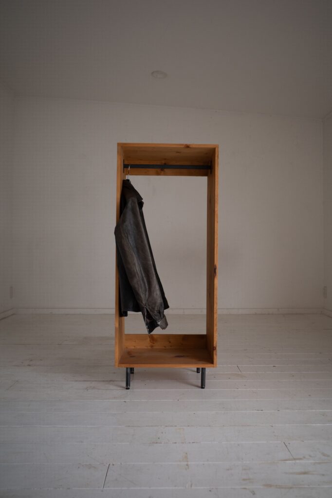 キャビネット型のハンガーラック。無垢の本体を4本のアイアン脚で支えるデザインです。