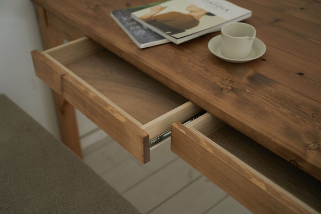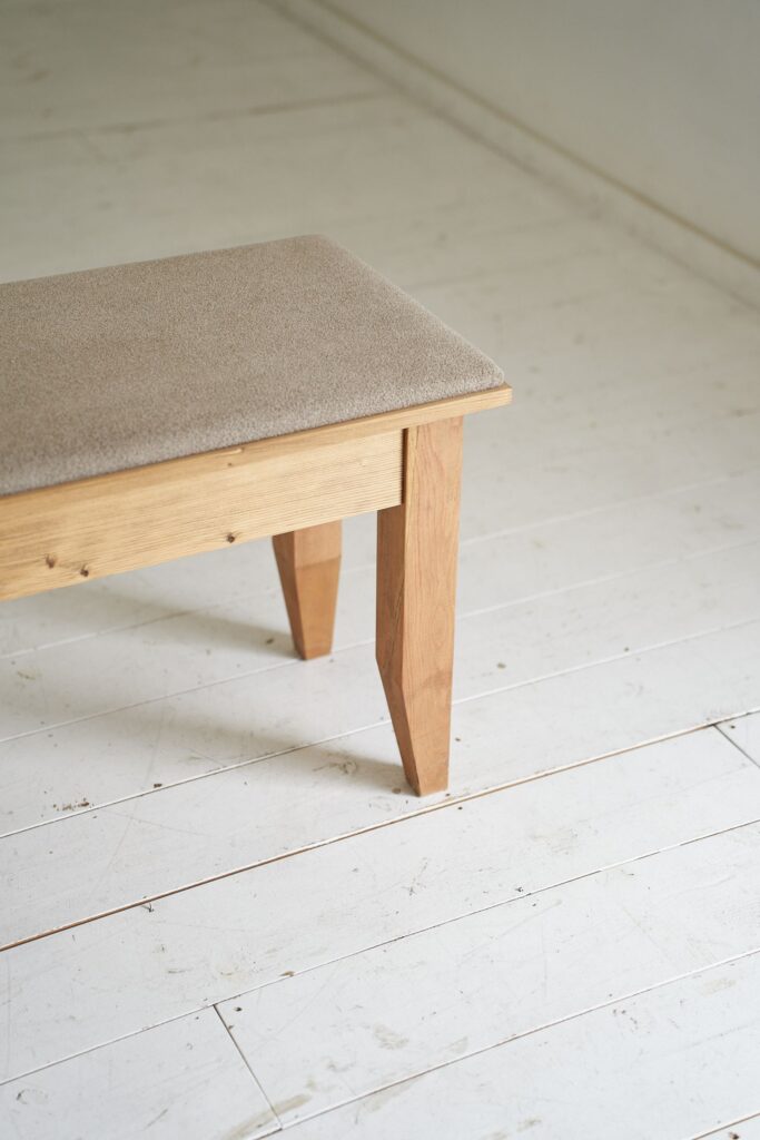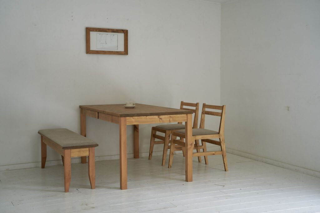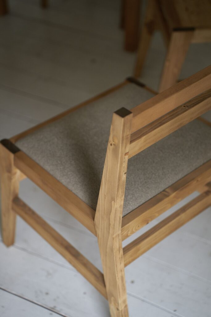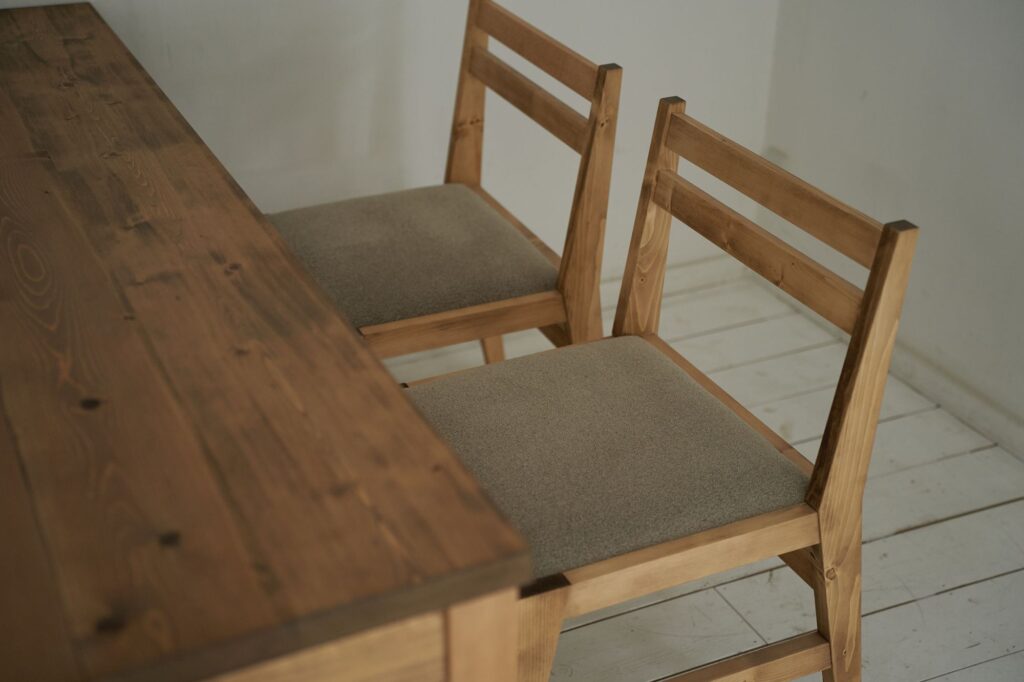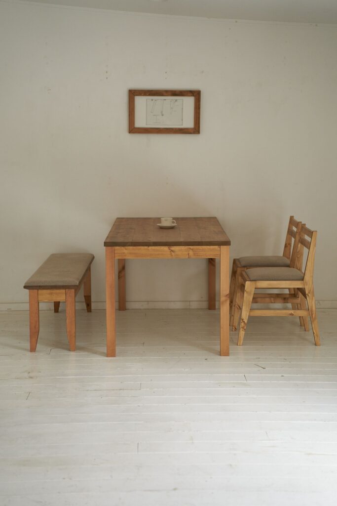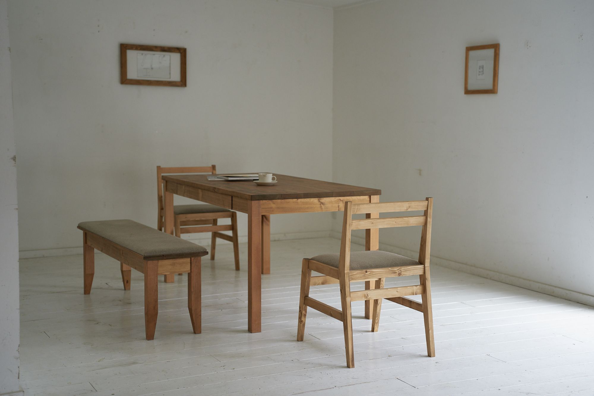 椅子とベンチの座面はクッションつき。無垢に包まれて、やさしい座り心地をお楽しみください。
