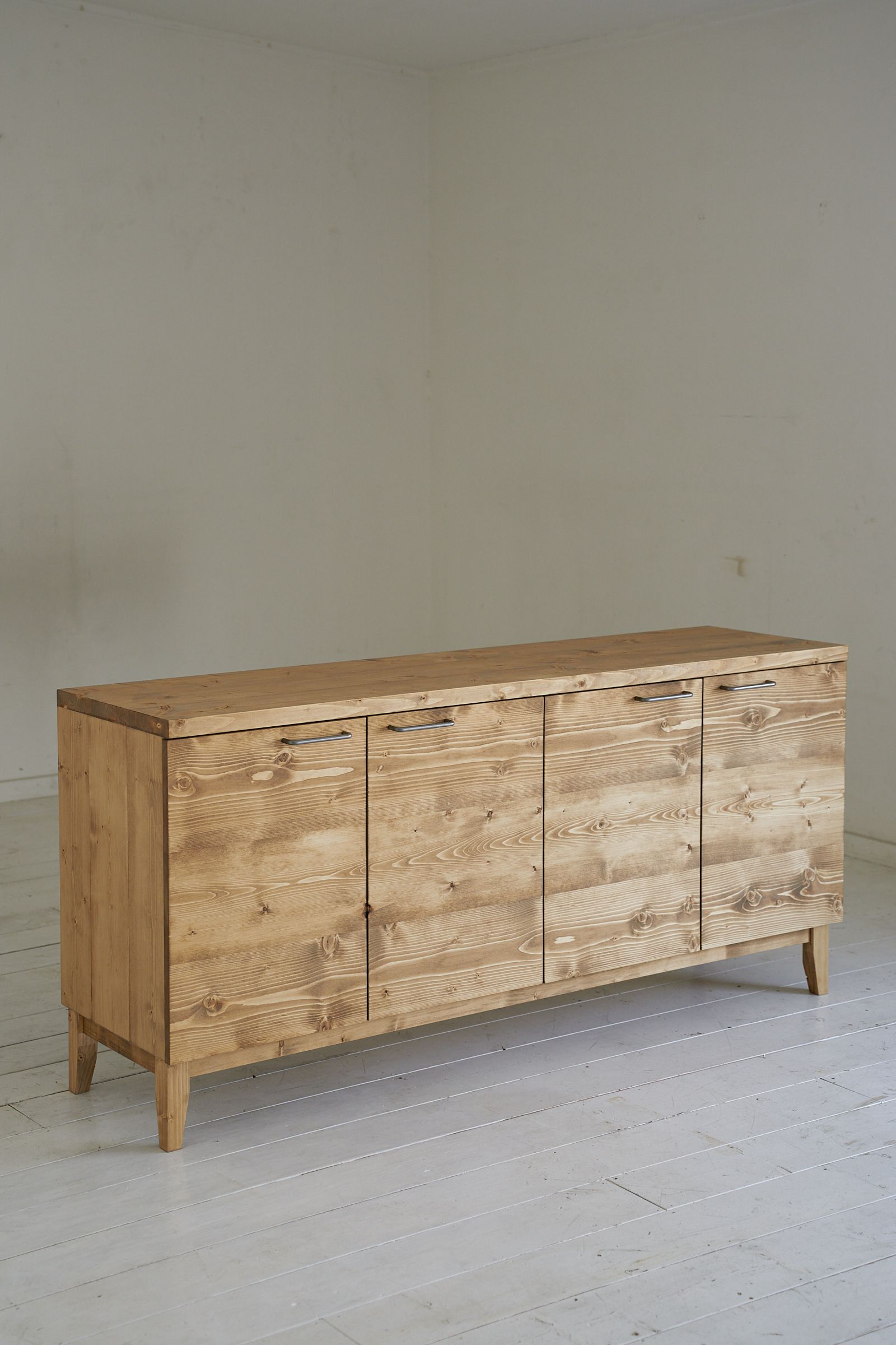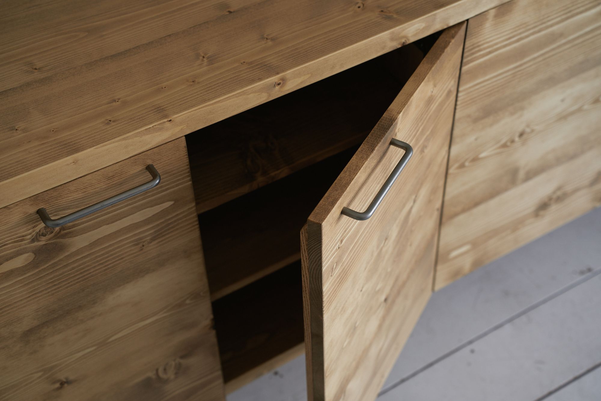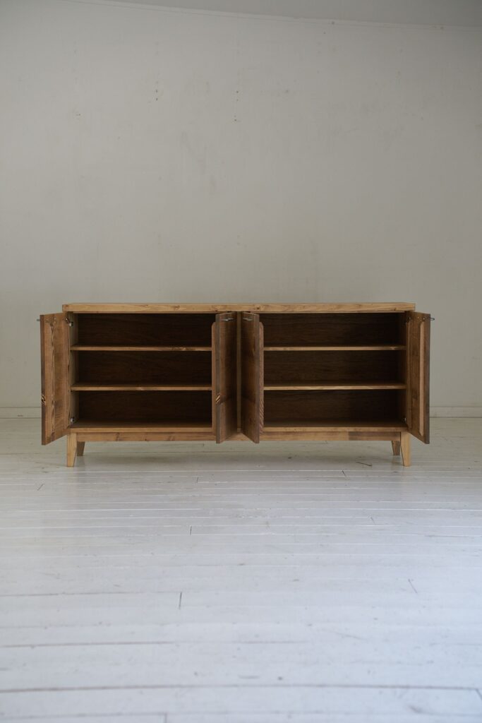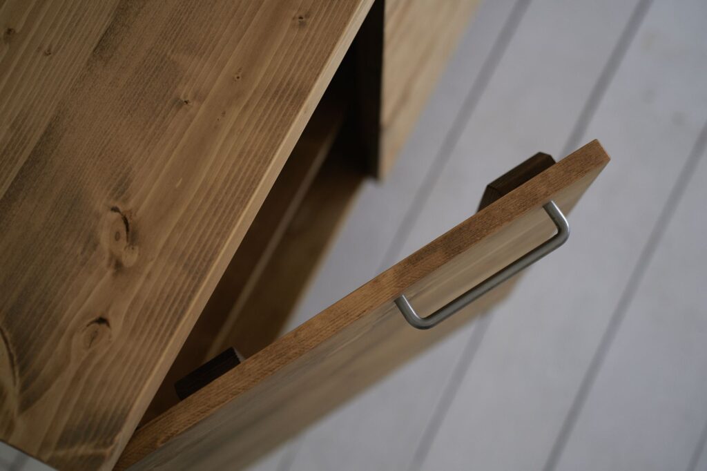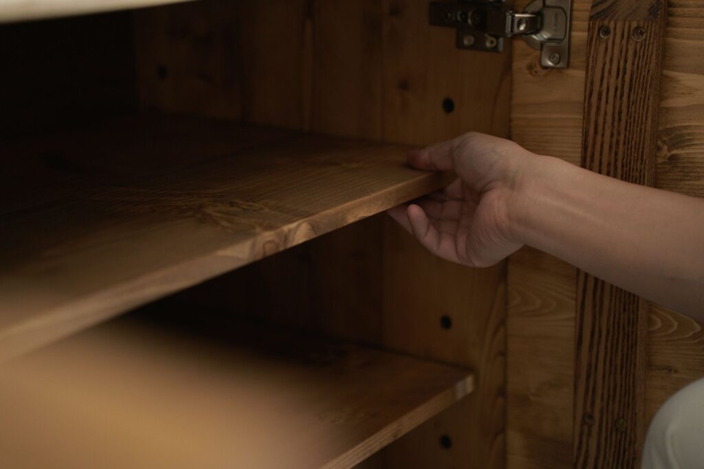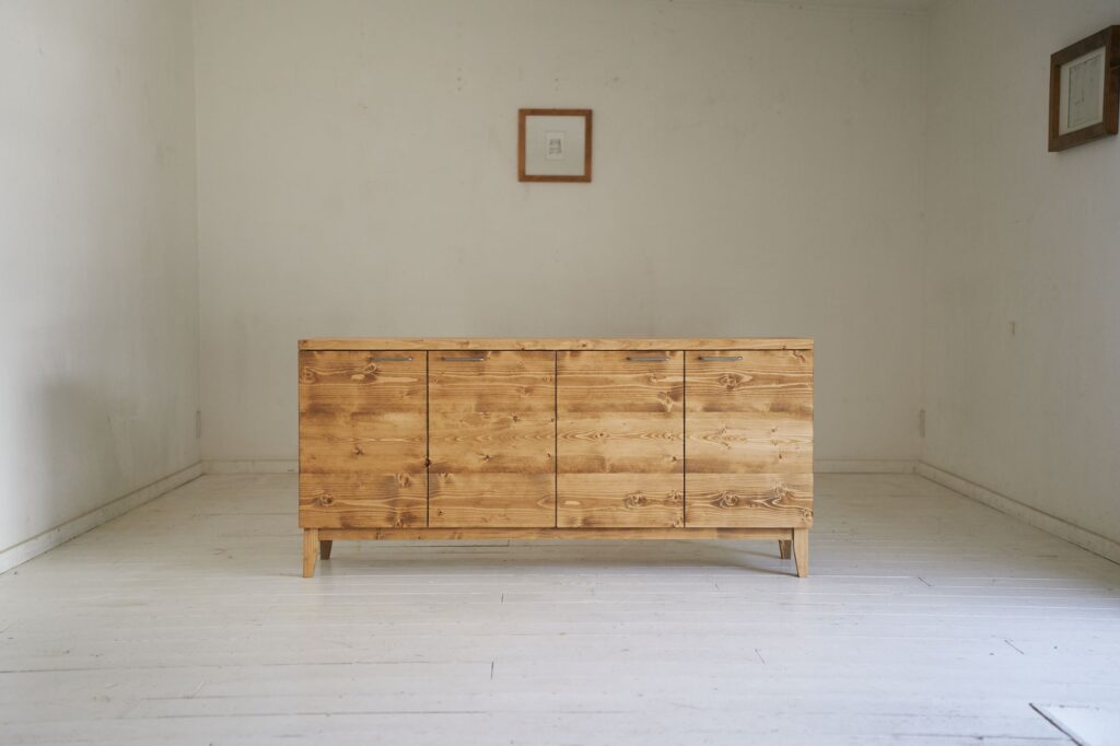 前面を覆う、力強く自然味あふれる木目が印象的な無垢扉のキャビネットです。